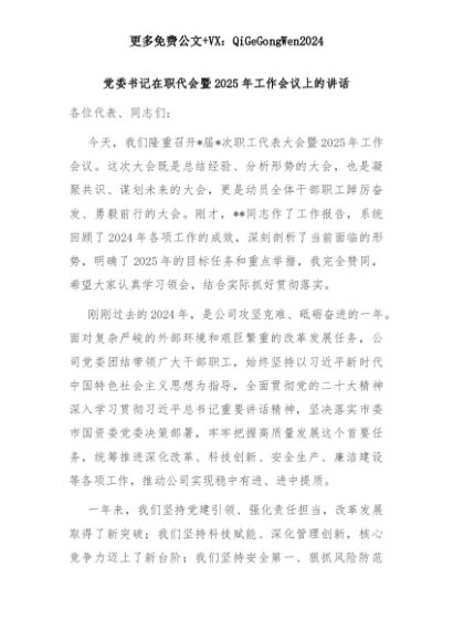 【七哥公文】2025年:党委书记在职代会暨2025年工作会议上的讲话+更多免费公文+VX:QiGeGongWen2024+更多免费公文+VX:QiGeGongWen2024