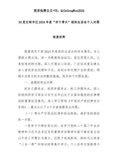 【七哥公文】2025年:XX党支部书记2024年度“四个带头”组织生活会个人对照检查材料+更多免费公文+VX:QiGeGongWen2024+更多免费公文+VX:QiGeGongWen2024