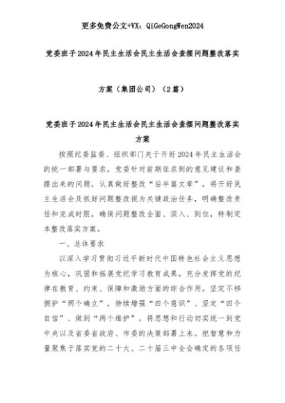 【七哥公文】2025年:(2篇)党委班子2024年民主生活会民主生活会查摆问题整改落实方案(集团公司)+更多免费公文+VX:QiGeGongWen2024+更多免费公文+VX:QiGeGongWen2024