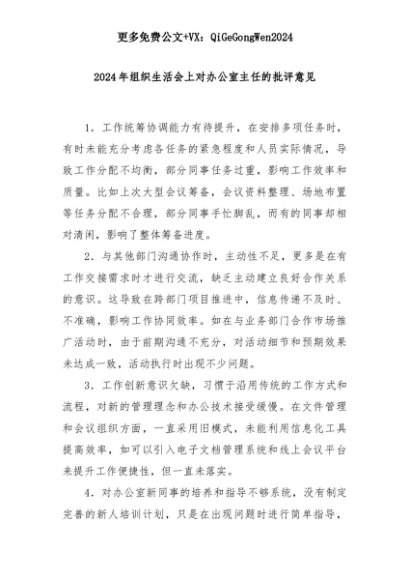 【七哥公文】2025年:2024年组织生活会上对办公室主任的批评意见+更多免费公文+VX:QiGeGongWen2024+更多免费公文+VX:QiGeGongWen2024
