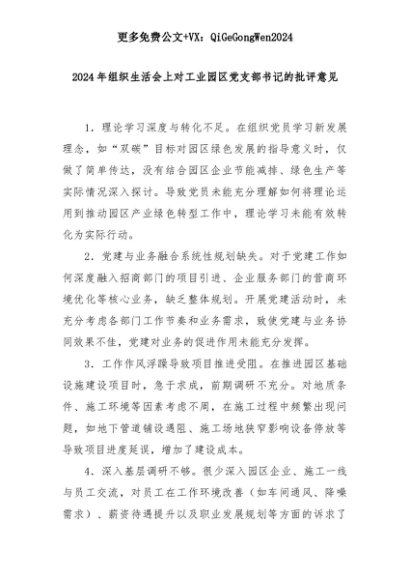 【七哥公文】2025年:2024年组织生活会上对工业园区党支部书记的批评意见+更多免费公文+VX:QiGeGongWen2024+更多免费公文+VX:QiGeGongWen2024