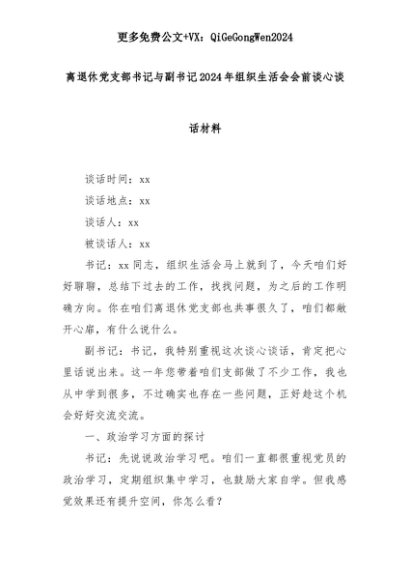 【七哥公文】2025年:离退休党支部书记与副书记2024年组织生活会会前谈心谈话材料+更多免费公文+VX:QiGeGongWen2024+更多免费公文+VX:QiGeGongWen2024
