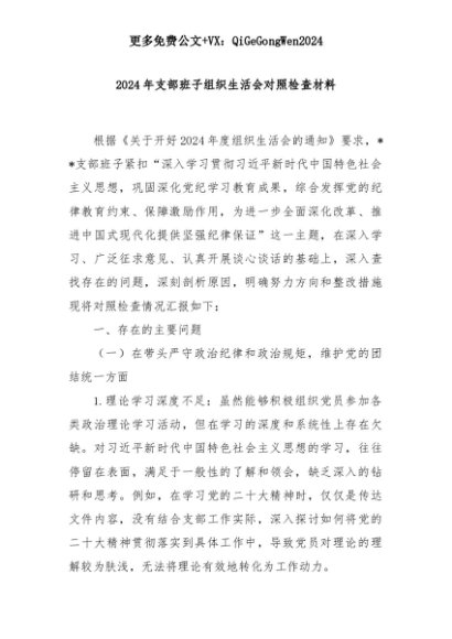 【七哥公文】2025年:2024年支部班子组织生活会对照检查材料+更多免费公文+VX:QiGeGongWen2024+更多免费公文+VX:QiGeGongWen2024