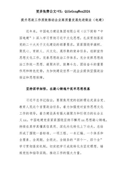 【七哥公文】2025年:提升思政工作质效推动企业高质量发展先进做法(电建)+更多免费公文+VX:QiGeGongWen2024+更多免费公文+VX:QiGeGongWen2024