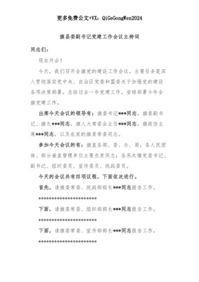 【七哥公文】2025年:旗县委副书记党建工作会议主持词+更多免费公文+VX:QiGeGongWen2024+更多免费公文+VX:QiGeGongWen2024