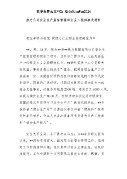 【七哥公文】2025年:热力公司安全生产监督管理部安全工程师事迹材料+更多免费公文+VX:QiGeGongWen2024+更多免费公文+VX:QiGeGongWen2024