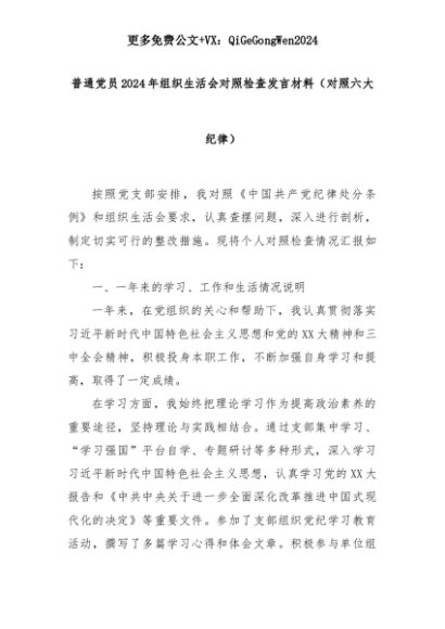 【七哥公文】2025年:普通党员2024年组织生活会对照检查发言材料(对照六大纪律)+更多免费公文+VX:QiGeGongWen2024+更多免费公文+VX:QiGeGongWen2024