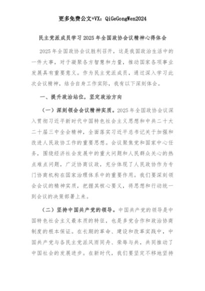 【七哥公文】2025年:民主党派成员学习2025年全国政协会议精神心得体会+更多免费公文+VX:QiGeGongWen2024+更多免费公文+VX:QiGeGongWen2024