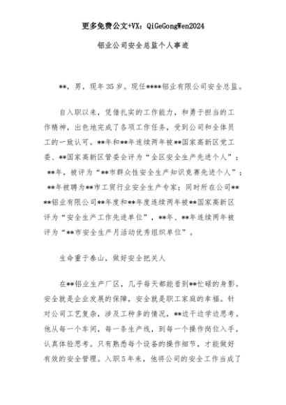 【七哥公文】2025年:铝业公司安全总监个人事迹+更多免费公文+VX:QiGeGongWen2024+更多免费公文+VX:QiGeGongWen2024