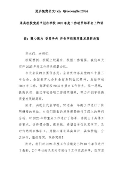 【七哥公文】2025年:某高校校党委书记在学校2025年度工作动员部署会上的讲话:凝心聚力 奋勇争先 开创学校高质量发展新局面+更多免费公文+VX:QiGeGongWen2024+更多免费公文+VX:QiGeGongWen2024