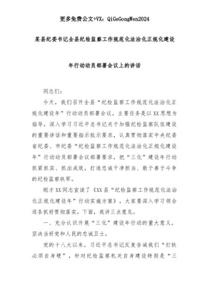 【七哥公文】2025年:某县纪委书记全县纪检监察工作规范化法治化正规化建设年行动动员部署会议上的讲话+更多免费公文+VX:QiGeGongWen2024+更多免费公文+VX:QiGeGongWen2024