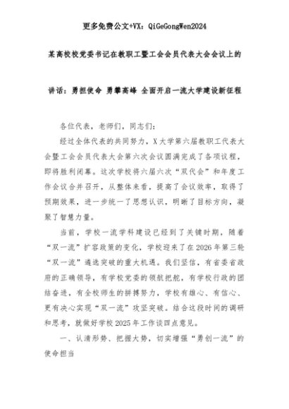 【七哥公文】2025年:某高校校党委书记在教职工暨工会会员代表大会会议上的讲话:勇担使命 勇攀高峰 全面开启一流大学建设新征程+更多免费公文+VX:QiGeGongWen2024+更多免费公文+VX:QiGeGongWen2024