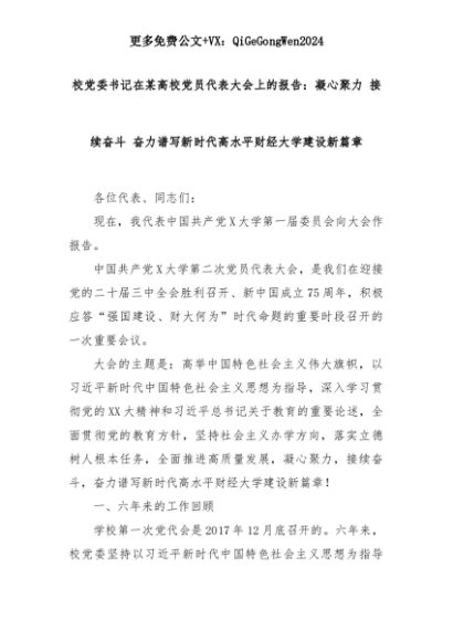 【七哥公文】2025年:校党委书记在某高校党员代表大会上的报告:凝心聚力 接续奋斗 奋力谱写新时代高水平财经大学建设新篇章+更多免费公文+VX:QiGeGongWen2024+更多免费公文+VX:QiGeGongWen2024
