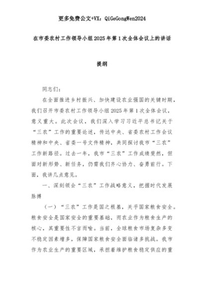 【七哥公文】2025年:在市委农村工作领导小组2025年第1次全体会议上的讲话提纲+更多免费公文+VX:QiGeGongWen2024+更多免费公文+VX:QiGeGongWen2024
