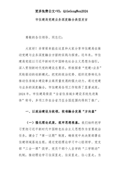 【七哥公文】2025年:市住建局党建业务深度融合典型发言+更多免费公文+VX:QiGeGongWen2024+更多免费公文+VX:QiGeGongWen2024