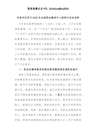 【七哥公文】2025年:市委书记学习2025年全国两会精神中心组研讨发言材料+更多免费公文+VX:QiGeGongWen2024+更多免费公文+VX:QiGeGongWen2024