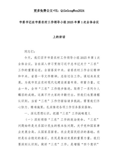 【七哥公文】2025年:市委书记在市委农村工作领导小组2025年第1次全体会议上的讲话+更多免费公文+VX:QiGeGongWen2024+更多免费公文+VX:QiGeGongWen2024