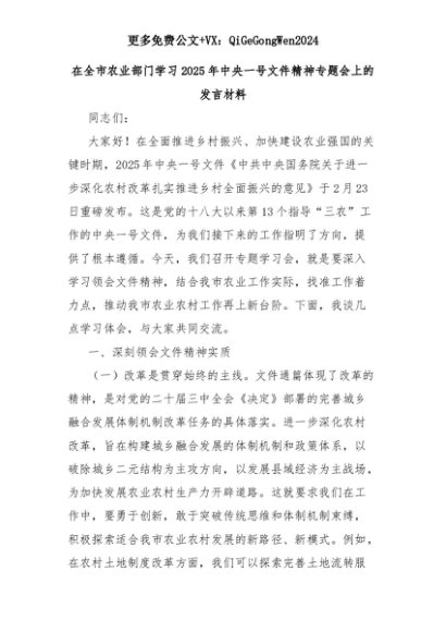 【七哥公文】2025年:在全市农业部门学习2025年中央一号文件精神专题会上的发言材料+更多免费公文+VX:QiGeGongWen2024+更多免费公文+VX:QiGeGongWen2024