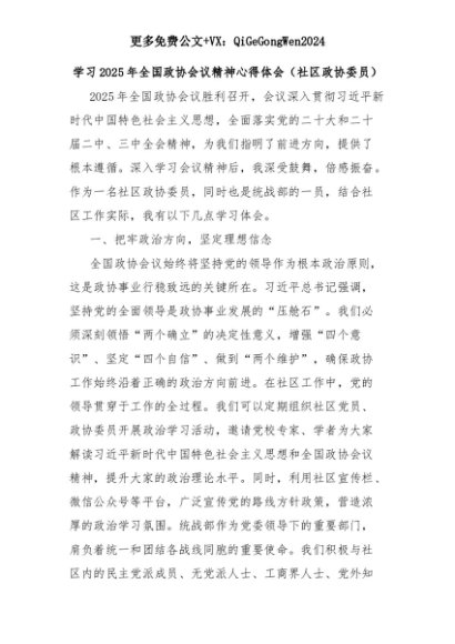 【七哥公文】2025年:学习2025年全国政协会议精神心得体会(社区政协委员)+更多免费公文+VX:QiGeGongWen2024+更多免费公文+VX:QiGeGongWen2024