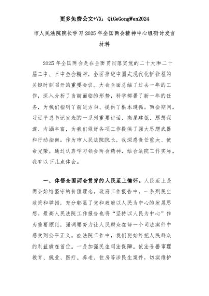 【七哥公文】2025年:市人民法院院长学习2025年全国两会精神中心组研讨发言材料+更多免费公文+VX:QiGeGongWen2024+更多免费公文+VX:QiGeGongWen2024