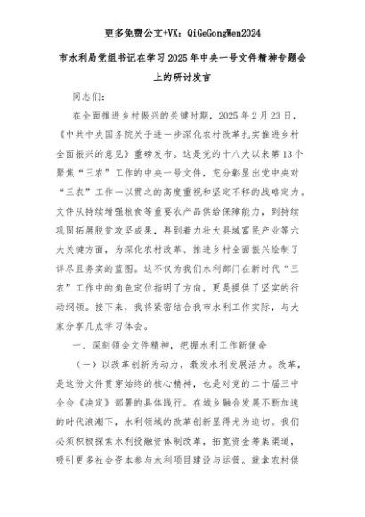 【七哥公文】2025年:市水利局党组书记在学习2025年中央一号文件精神专题会上的研讨发言+更多免费公文+VX:QiGeGongWen2024+更多免费公文+VX:QiGeGongWen2024