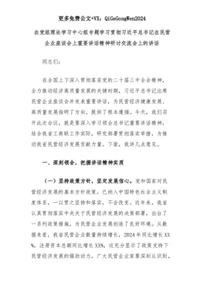 【七哥公文】2025年:在党组理论学习中心组专题学习贯彻习近平总书记在民营企业座谈会上重要讲话精神研讨交流会上的讲话+更多免费公文+VX:QiGeGongWen2024+更多免费公文+VX:QiGeGongWen2024