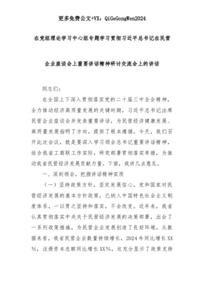 【七哥公文】2025年:在党组理论学习中心组专题学习贯彻总书记在民营企业座谈会上重要讲话精神研讨交流会上的讲话+更多免费公文+VX:QiGeGongWen2024+更多免费公文+VX:QiGeGongWen2024