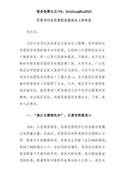 【七哥公文】2025年:区委书记在民营经济座谈会上的讲话+更多免费公文+VX:QiGeGongWen2024+更多免费公文+VX:QiGeGongWen2024