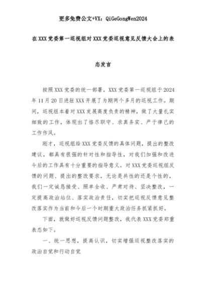 【七哥公文】2025年:在XXX党委第一巡视组对XXX党委巡视意见反馈大会上的表态发言+更多免费公文+VX:QiGeGongWen2024+更多免费公文+VX:QiGeGongWen2024