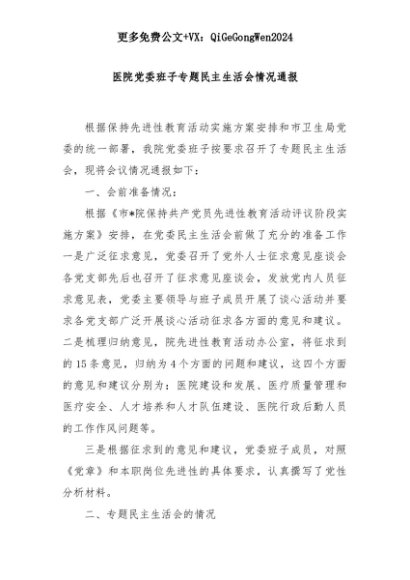 【七哥公文】2025年:医院党委班子专题民主生活会情况通报 (2)+更多免费公文+VX:QiGeGongWen2024+更多免费公文+VX:QiGeGongWen2024