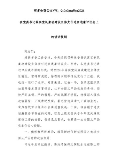 【七哥公文】2025年:在党委书记落实党风廉政建设主体责任述责述廉评议会上的讲话提纲+更多免费公文+VX:QiGeGongWen2024+更多免费公文+VX:QiGeGongWen2024
