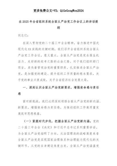 【七哥公文】2025年:在2025年全省组织系统全面从严治党工作会议上的讲话提纲+更多免费公文+VX:QiGeGongWen2024+更多免费公文+VX:QiGeGongWen2024