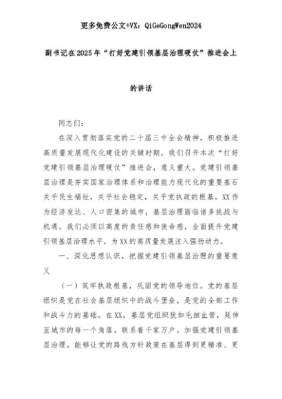 【七哥公文】2025年:副书记在2025年“打好党建引领基层治理硬仗”推进会上的讲话+更多免费公文+VX:QiGeGongWen2024+更多免费公文+VX:QiGeGongWen2024