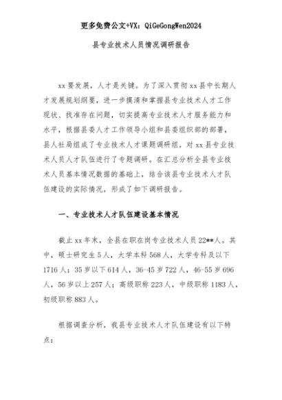 【七哥公文】2025年:县专业技术人员情况调研报告+更多免费公文+VX:QiGeGongWen2024+更多免费公文+VX:QiGeGongWen2024