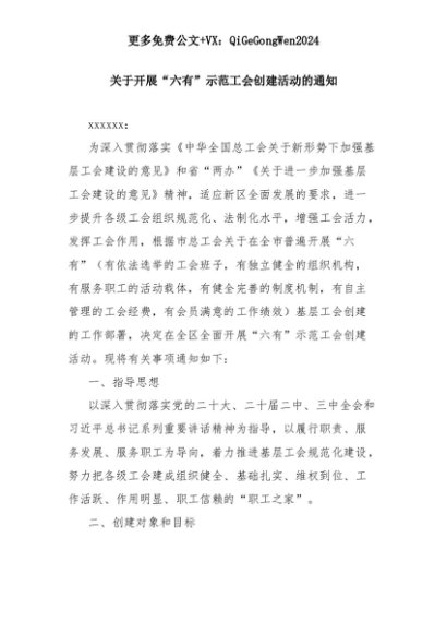 【七哥公文】2025年:关于开展“六有”示范工会创建活动的通知+更多免费公文+VX:QiGeGongWen2024+更多免费公文+VX:QiGeGongWen2024