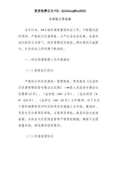 【七哥公文】2025年:乡四治工作总结+更多免费公文+VX:QiGeGongWen2024+更多免费公文+VX:QiGeGongWen2024