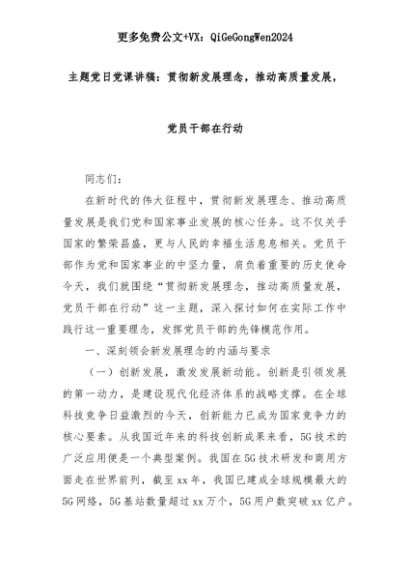 【七哥公文】2025年:主题党日党课讲稿:贯彻新发展理念,推动高质量发展,党员干部在行动+更多免费公文+VX:QiGeGongWen2024+更多免费公文+VX:QiGeGongWen2024