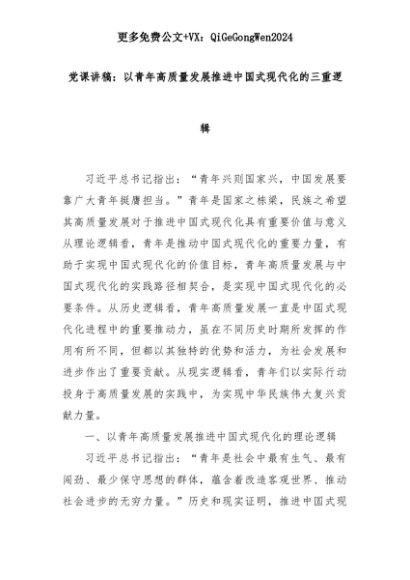 【七哥公文】2025年:党课讲稿:以青年高质量发展推进中国式现代化的三重逻辑+更多免费公文+VX:QiGeGongWen2024+更多免费公文+VX:QiGeGongWen2024