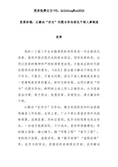 【七哥公文】2025年:党课讲稿:以解决“四为”问题为导向深化干部人事制度改革+更多免费公文+VX:QiGeGongWen2024+更多免费公文+VX:QiGeGongWen2024
