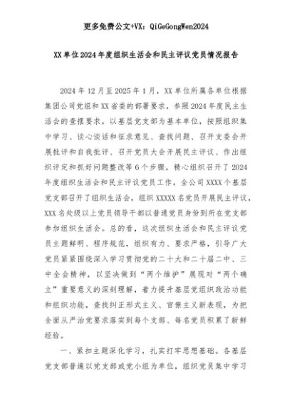 【七哥公文】2025年:XX单位2024年度组织生活会和民主评议党员情况报告+更多免费公文+VX:QiGeGongWen2024+更多免费公文+VX:QiGeGongWen2024