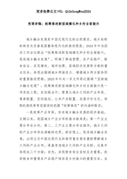 【七哥公文】2025年:党课讲稿:统筹推进新型城镇化和乡村全面振兴+更多免费公文+VX:QiGeGongWen2024+更多免费公文+VX:QiGeGongWen2024