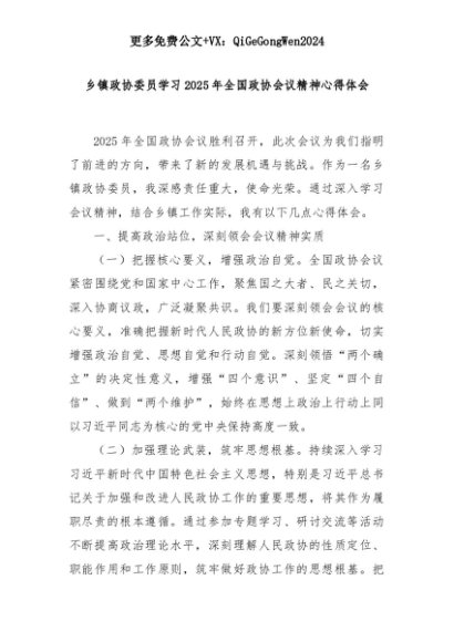 【七哥公文】2025年:乡镇政协委员学习2025年全国政协会议精神心得体会+更多免费公文+VX:QiGeGongWen2024+更多免费公文+VX:QiGeGongWen2024