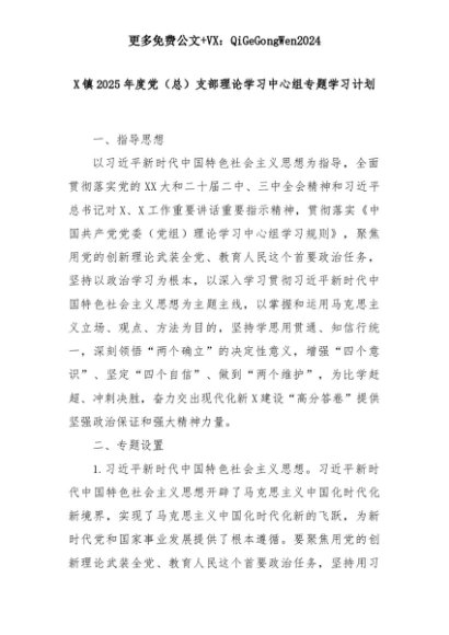 【七哥公文】2025年:X镇2025年度党(总)支部理论学习中心组专题学习计划+更多免费公文+VX:QiGeGongWen2024+更多免费公文+VX:QiGeGongWen2024