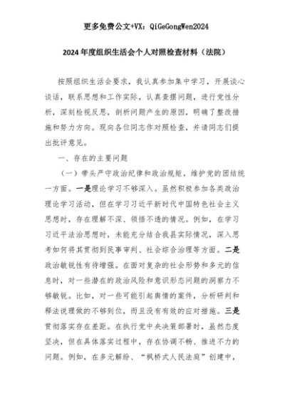 【七哥公文】2025年:2024年度组织生活会个人对照检查材料(法院)+更多免费公文+VX:QiGeGongWen2024+更多免费公文+VX:QiGeGongWen2024