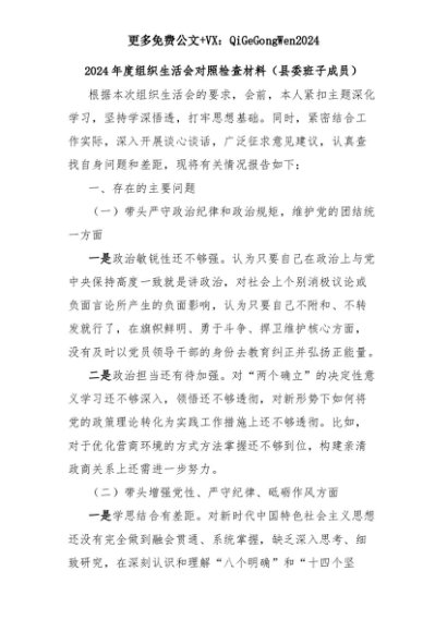 【七哥公文】2025年:2024年度组织生活会对照检查材料(县委班子成员)+更多免费公文+VX:QiGeGongWen2024+更多免费公文+VX:QiGeGongWen2024