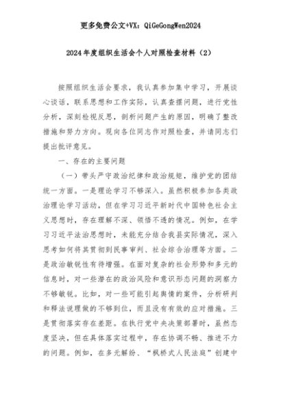 【七哥公文】2025年:2024年度组织生活会个人对照检查材料(2)+更多免费公文+VX:QiGeGongWen2024+更多免费公文+VX:QiGeGongWen2024