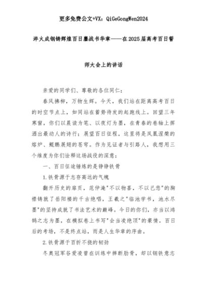 【七哥公文】2025年:淬火成钢铸辉煌 百日鏖战书华章——在2025届高考百日誓师大会上的讲话+更多免费公文+VX:QiGeGongWen2024+更多免费公文+VX:QiGeGongWen2024