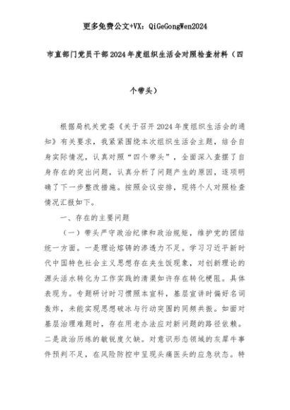 【七哥公文】2025年:市直部门党员干部2024年度组织生活会对照检查材料(四个带头)+更多免费公文+VX:QiGeGongWen2024+更多免费公文+VX:QiGeGongWen2024