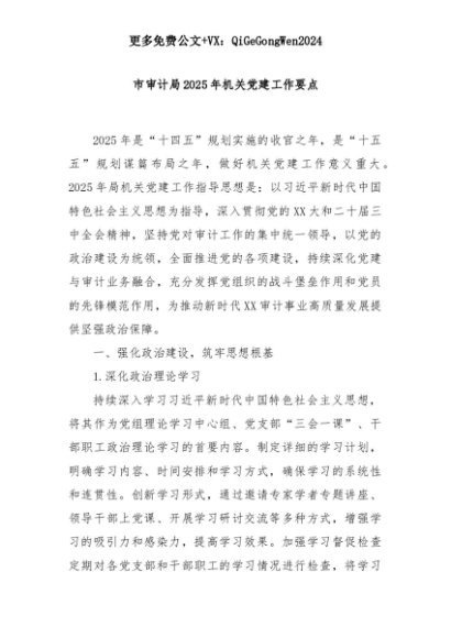 【七哥公文】2025年:市审计局2025年机关党建工作要点+更多免费公文+VX:QiGeGongWen2024+更多免费公文+VX:QiGeGongWen2024