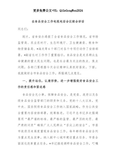 【七哥公文】2025年:在食品安全工作电视电话会议续会讲话+更多免费公文+VX:QiGeGongWen2024+更多免费公文+VX:QiGeGongWen2024